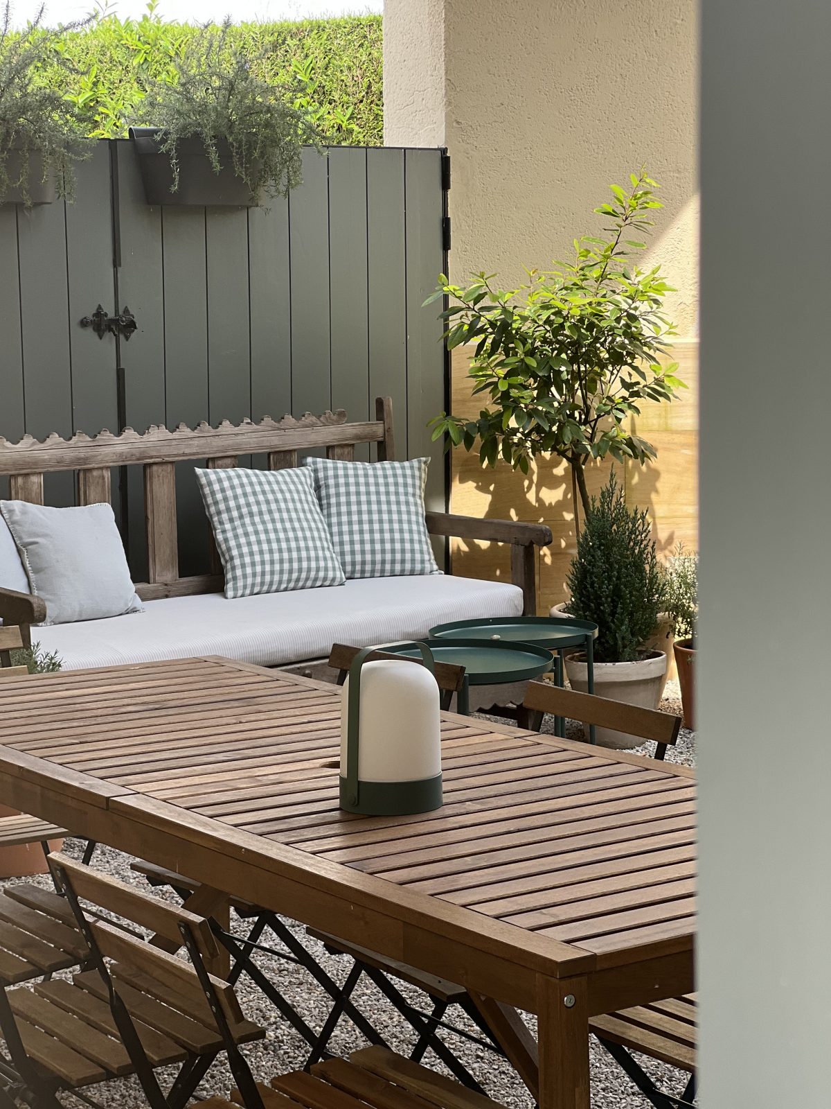 Zona exterior: mobiliario y comedor al aire libre.